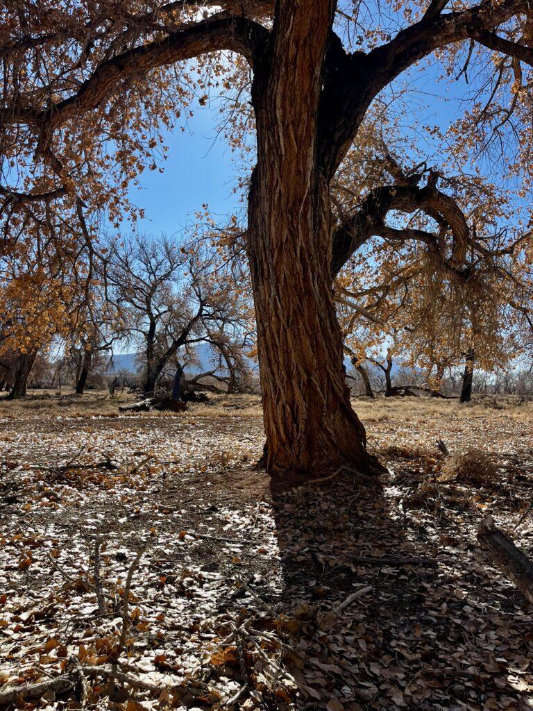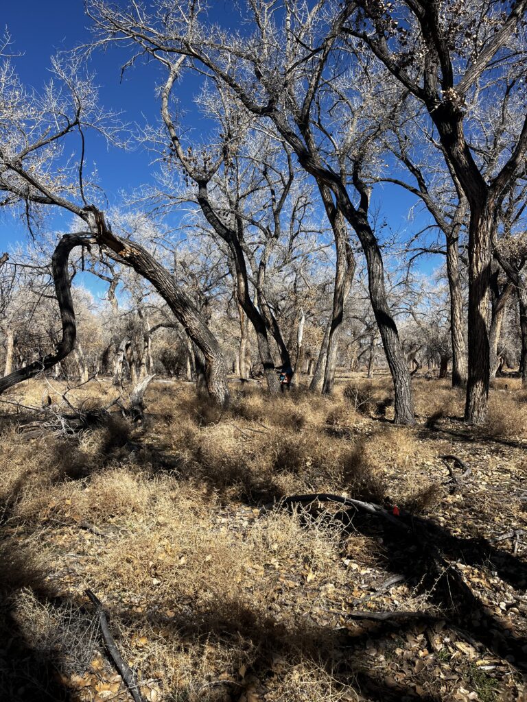 “The bosque is such a unique and really quite strange ecosystem. It’s beautiful, and I think that part of its beauty comes from the same reasons why we find manicured parks beautiful. Both parks and the bosque are savanna-like: tall trees with high crowns and grasses (or Russian thistle) underneath. This creates an environment with shade and protection from above, but not much to disrupt sightlines at ground-level, allowing us to feel both sheltered but also aware of our surroundings. These are also the kinds of ecosystems (at least in structure if not plant and animal communities) that we evolved in 250,000 years ago, so there might still be a part of us that recognizes them as ‘home.’ What makes it feel so strange is that the bosque is a fundamentally unnatural ecosystem in its current state. The floods that once maintained it don’t happen anymore. Perhaps that is part of the beauty too – the tragic sort of beauty of a thing you know will not last, which makes it all the more striking in the moments we get to experience it.”