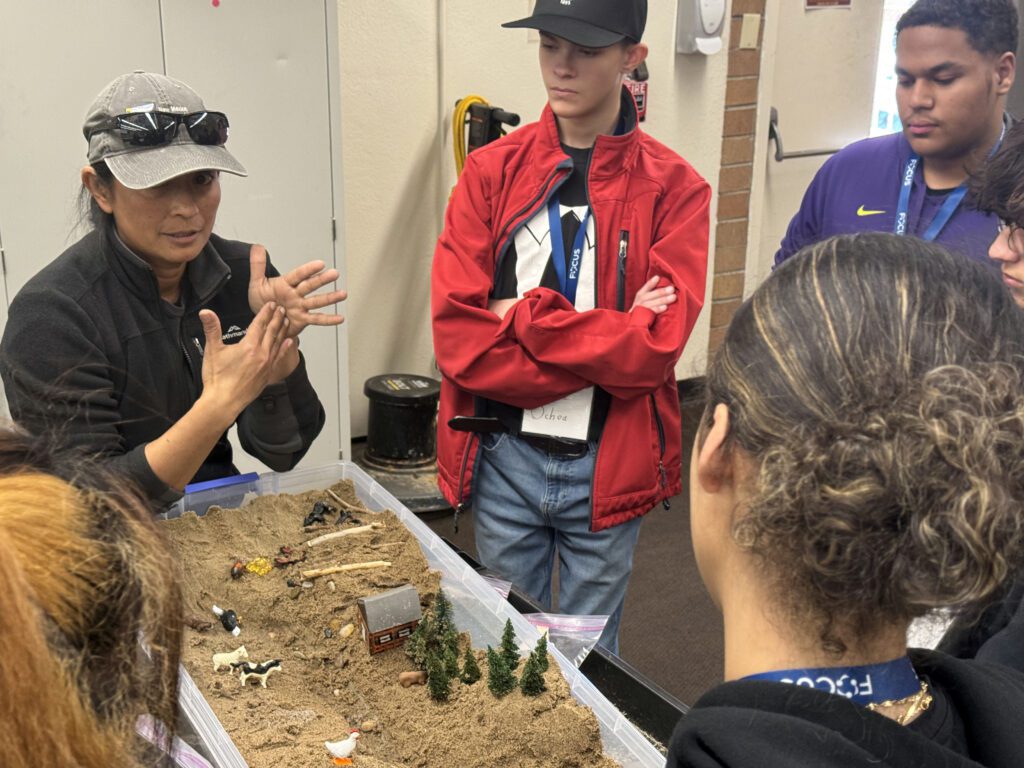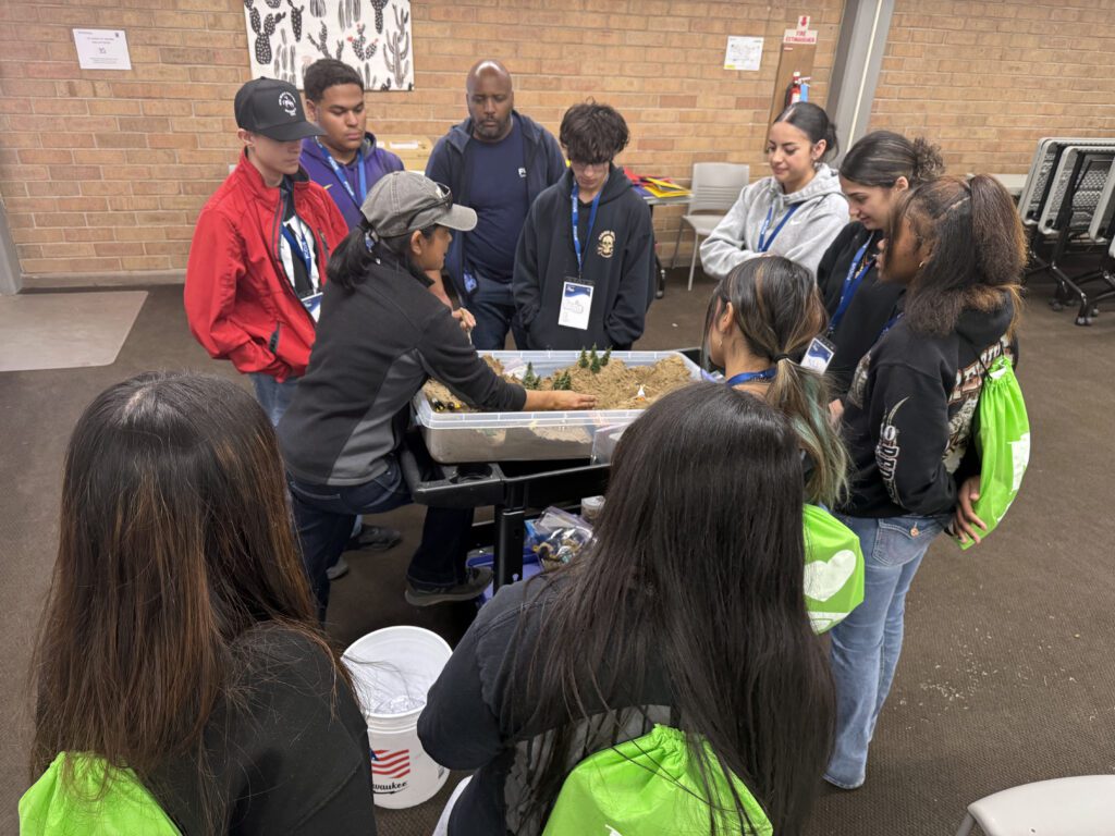 As part of GEAR UP on March 4, three dozen high schoolers from Taos, Española, Santa Fe, Bernalillo, Albuquerque, Mountainair, and Socorro explored forestry careers at NMHU, through hands-on workshops at the NM Forest & Watershed Restoration Institute (NMFWRI), NM Department of Forestry and the NM Reforestation Center. In the photos, high school students learn how wildfires affect watersheds and some methods to reduce erosion from NMFWRI’s Shantini Ramakrishnan, Conservation Science Center manager, and Kathryn Mahan, Ecological Monitoring program manager.